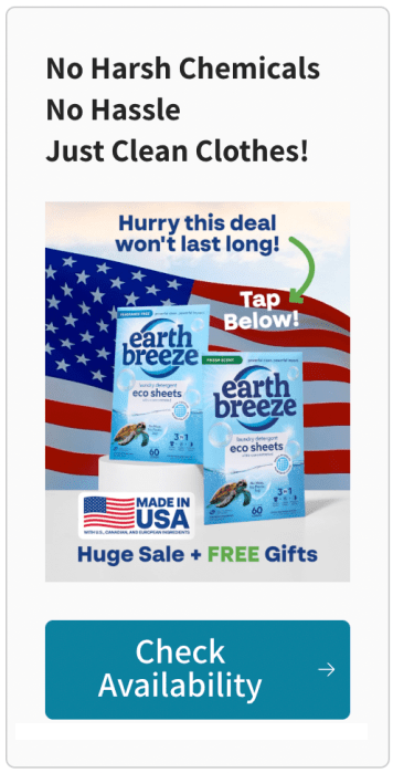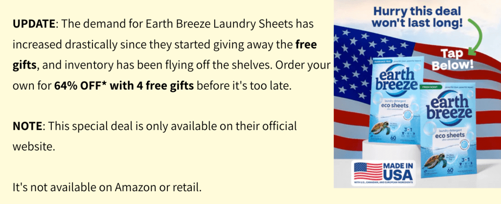 UPDATE: The demand for Earth Breeze Laundry Sheets has increased drastically since they started giving away the free gifts, and inventory has been flying off the shelves. Order your own for 64% OFF with 4 free gifts before its too late.